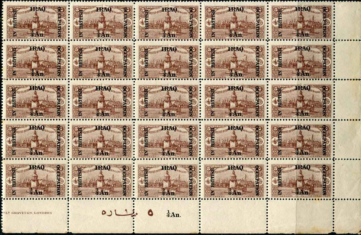 Iraq – British Occupation: 1918 (1 September). 1/4a surcharged on Ottoman 5pa Leander’s Tower unmounted mint bottom right corner marginal imprint block of 25. Some separation and tone spots. Sg.1