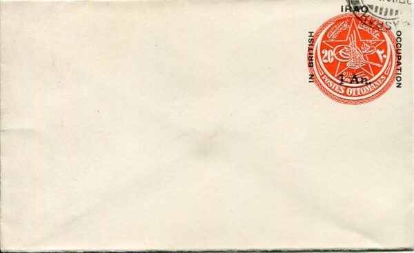Iraq: Unused Ottoman 20pa postal stationery envelope surcharged 1An. with British Occupation overprint struck by part Ashar datestamp.