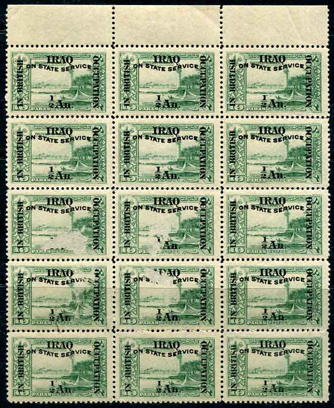 Iraq – British Occupation: 1920 (16 May). Official stamps 1/2a. no watermark surcharged on Ottoman 10pa. Lighthouse Garden unmounted mint top marginal block of 15. Few perf. separation and four stamps has surface soiling. Sg. O19