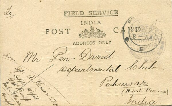 Iraq – MEF: 1918 (11 May). India Field Service formular card to Peshawar struck by BASE POST OFFICE 8 M.E.F datestamp and 25 May arrival cds. sent by a Sergeant serving in Nahr Umr oil fields near Basra.
