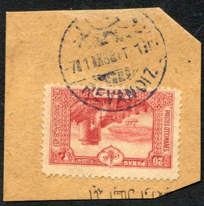 Iraq – Ottoman Post Offices: 20pa of 1914 pictorial stamp on piece struck by superb REVANDIZ (Rawandiz, vilayet Musul, IRQ #186, A&P type 3, RR) 30 June 1918 bi-lingual datestamp. No complete document of this type up to this date recorded.