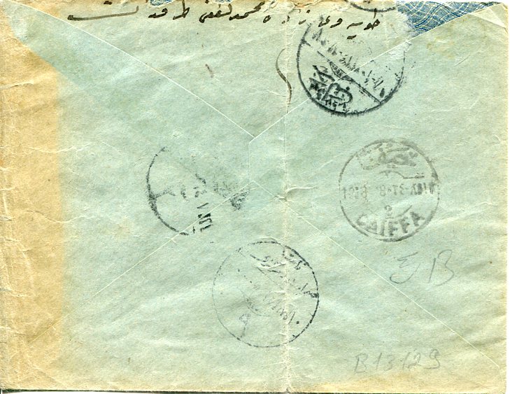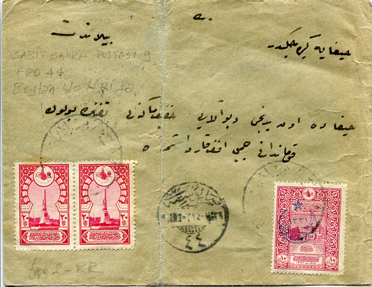 Ottoman Military: 1918 (4 July). Cover to Haifa franked with pair of 20pa of 1917 pictorial for one piastre single weight letter rate and 10pa war orphans overprinted stamps tied by BEYLAN [today Belen, Antakya] (vilayet Haleb, A&P type 2, RR) bilingual datestamps and 31 July Sahra Postasi 44 (Field Post Office) cds. Reverse 27 July Haleb 8 (A&P type 29, RR), 10 August Sabit Sahra Postasi 9 (Stationery Field Post Office) transit and 12 August Hayfa – Caiffa 2 arrival cds’s.