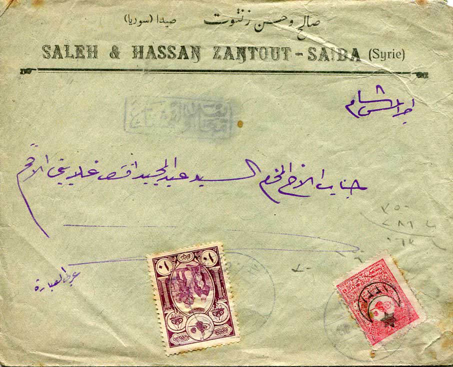 Ottoman Lebanon: 1918 (June). Commercial cover to Beirut franked with 20pa war opt for single weight littoral rate and 10pa War Orphans Tax stamps tied by all-Arabic SAIDA 1 (A&P type 7, RRR) datestamps and boxed Muayene Olunmustur (examined) censor cachet. Reverse 28 June Beyrouth 11 arrival cds. Very few recorded.