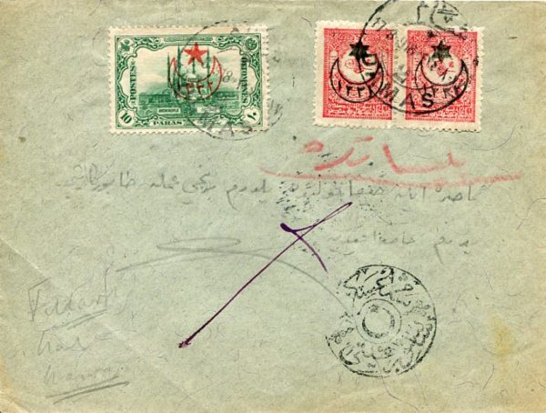 Ottoman Turkey – Military: 1918 (17 August). Cover addressed to Bisan (today Beit She’an) franked with pair of 20pa war opt issue for one piastre single weight letter rate and ten paras war orphans tax tied by Şam – Damas 2 (A&P type 10) datestamps and circular star & crescent type Damascus censor cachet. Reverse same day Sahra Postasi 44 (Field Post Office), located at Damas and 18 August Sabit Sahra Postasi 9 (Stationery Field Post Office) field post office exchange centre, located at Nazareth cds’s.