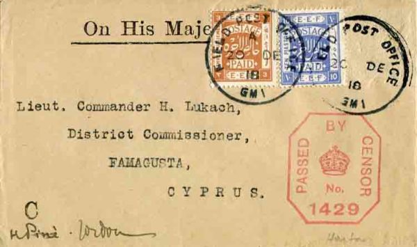 Palestine: 1918 (20 December). Small OHMS Cover to Famagusta, Cyprus franked with 3m and 10pi EEF stamps tied by Field Post Office GM1 of Haifa datestamp and no. 1429 censor cachet. Reverse Base Army Post Office T of Port Said transit cds.
