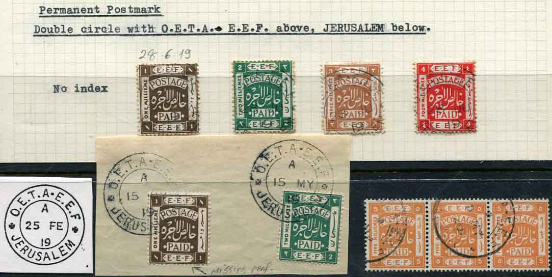 Palestine: 1918 – 1919 collection of nine EEF stamps with O.E.T.A. : E.E.F. * JERUSALEM * cancellations including a 1m with missing perf. variety.
