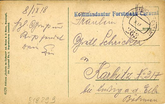 Romania: 1918 (8 September). Stampless postcard of Caracal struck by Austro-Hungarian Military Post datestamp and Kommandantur Forstmann Caracal straight line unit cachet.