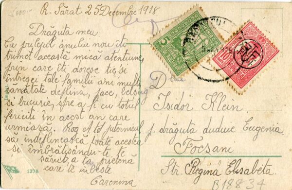Romania: 1918 (25 December). Postcard to Focsani franked with King Ferdinand monogram overprinted 10b and 5b postal tax tied by Ramnicu Sarat datestamp.
