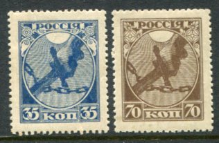 Russia – Soviet: 1918 sword and chain 35k mint o.g. and 70k unmounted mint set. Mi. 149/150x. */**