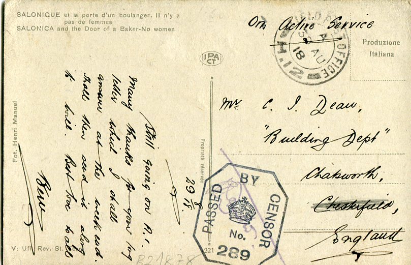 Greece: 1918 (30 August). Postcard titled ‘Salonica and the Door of a Baker – No women’ to England struck by Field Post Office H.12 datestamp (stationed in Salonika) and octagonal #289 censor cachet.
