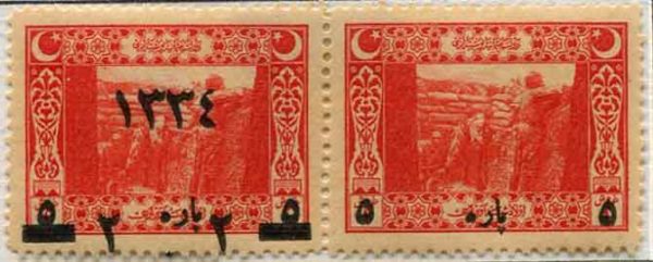 Ottoman: 1918 (1 August). 2pa further surcharged on 5pa on 1pi Gallipoli Trenches mint o.g. pair one without surcharge error. Isfila 889 SE182, Sg. 924e