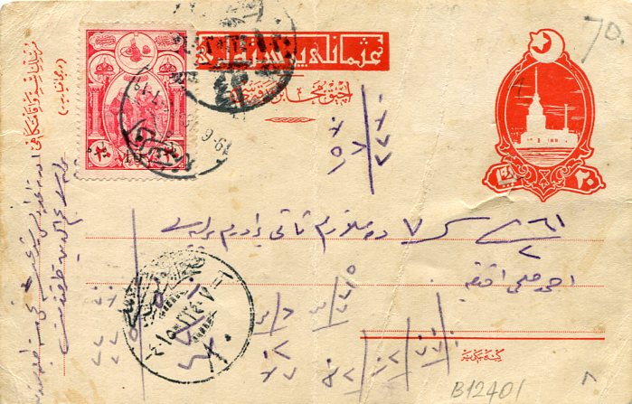 Ottoman Empire – Military: 1918 (19 June). 20pa postal stationery card with additional 10pa surcharged on 20pa for war orphans tax from an officer serving at 12th Army Corps, 20th Division, 61st Regiment stationed at Kalkilye (today Qalqilya, West Bank) Palestine tied by Edirne – Andrinople 5 (A&P type 37) datestamp next day Istanbul 42 transit cds and 9 July Sahra Postasi 80 field post office dispatch datestamp of the unit. Folded on middle and creased but very rare. Probably one of the latest recorded usage of the FPO80 in Palestine.