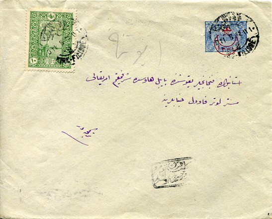 Ottoman Turkey: 1918 (10 November). Five pointed star&crescent overprinted 1pi postal stationery cover additionally franked 10pa for war orphans tax to Istanbul tied by Kirkkilise 2 (vilayet Konya, A&P type 14) bilingual datestamp and very rare double box Kirkkilise (Kirklareli) censor cachet. Reverse 13 November arrival cancellation.