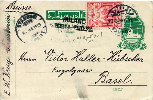Ottoman Turkey: 1918 (12 December). 10pa postal stationery card to Basel, Switzerland additionally franked with 20pa of War Orphans stamp for twenty paras postcard and ten paras war orphans tax rate tied by Samsoun – Samsun datestamp, 6 January 1919 Istanbul and Milano / Posta Estera transit cancellations.