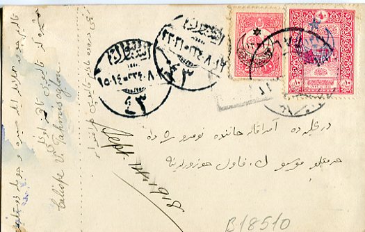 Ottoman Turkey: 1918 (13 August). Private formular card to Istanbul franked with 20pa and 10 for postcard rate and 10pa for war orphans tax tied by Talas (vilayet Ankara, A&P type 4) bilingual datestamp, 19 & 20 August Istanbul 43 arrival cds’s and illegible rectangular censor cachet.