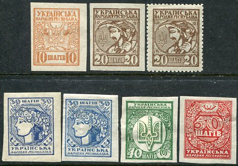Ukraine: 1918 (July). Thin paper imperforate mint o.g. set with additional 30sh colour variation and scarce 20sh perf. 11 1/2 mint o.g. on thin paper. Sg. 1/5, 3a