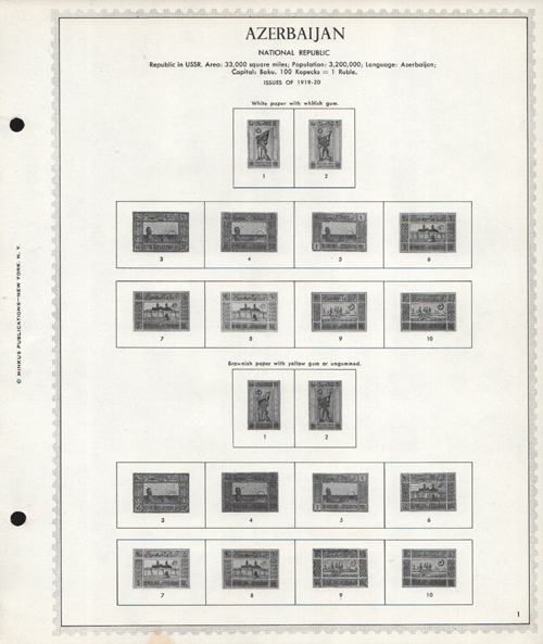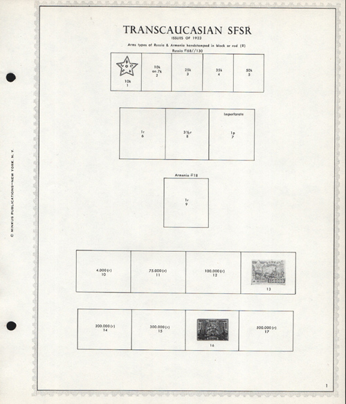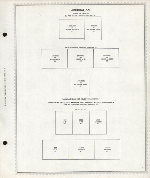 Azerbaijan & Transcaucasian SFSR: 1919 – 1923 Minkus unused 8 pages for stamps of Azerbaijan National Republic and Transcaucasian SFSR.