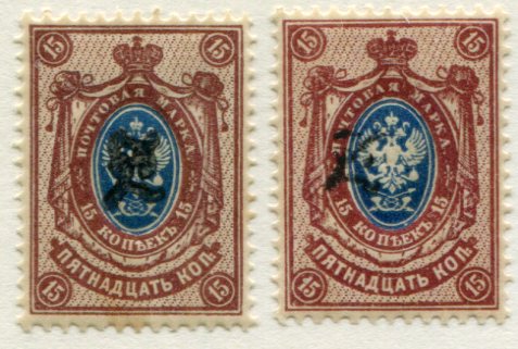 Armenia: 1919 (November-December). Russian Arms type two 15k handstamped āZā monogram in black mint o.g. with rust spot and unmounted mint. Mi. 33a. * / **