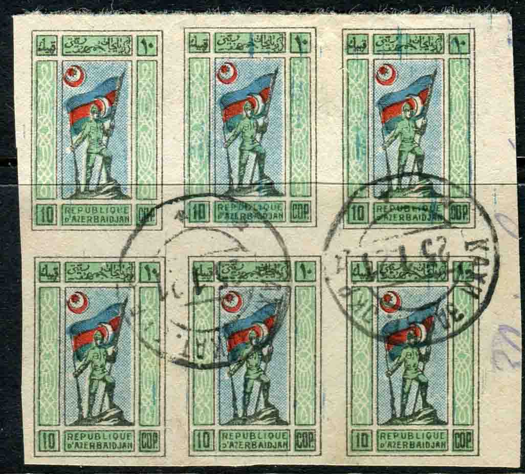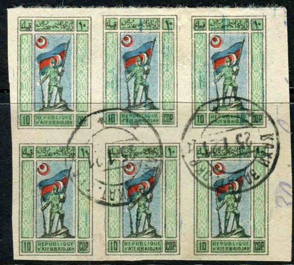 Russia – Azerbaijan: 1919 National Republic 10k Standard Flag Bearer imperforate marginal block of six tied by extremely rare multiple KAKHY ZAKAT. OKR 25.1.1921 date stamps. No cover recorded from this town. Sc. 1