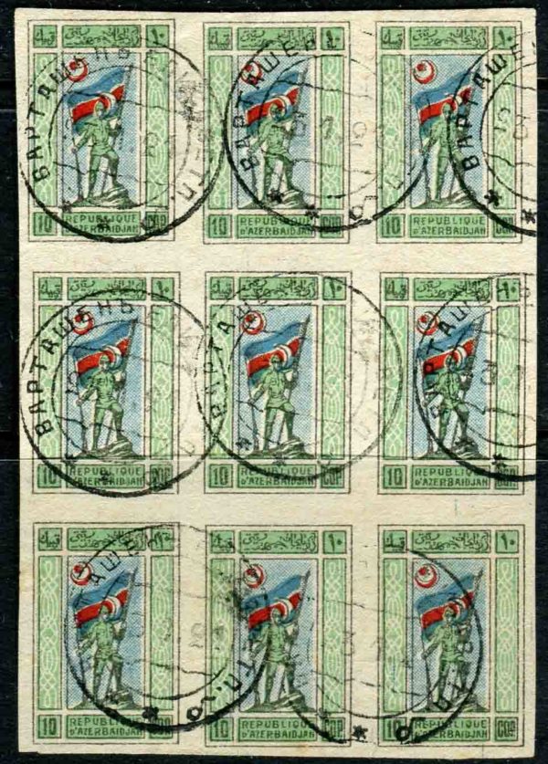 Russia – Azerbaijan: 1919 National Republic 10k Standard Flag Bearer imperforate block of nine tied by extremely rare multiple OGHUZ – VARTASHEN ELIZAVET serial “b” 23.1.1921 date stamps. Sc. 1