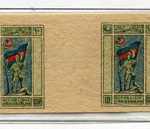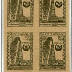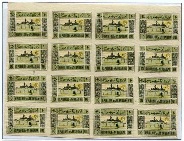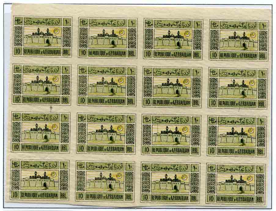 Azerbaijan: 1919 (20 October). First printing pictorial imperforate 10r unmounted mint block of 16, folded vertically on middle. Scott 8