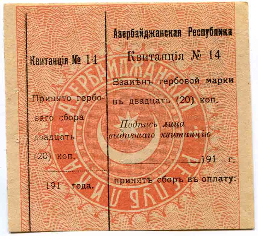 Azerbaijan: 1919 two part 20k Court Fees (Kvitantsia) stamp with vertical roulette separating the two halves. Scarce item from the Musvat period.