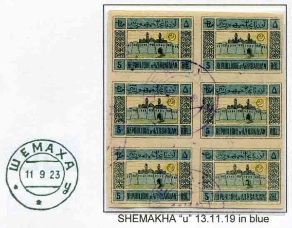 Azerbaijan: 1919 (20 October). First printing pictorial imperforate 5r block of six with superb SHEMAKHA “u” 13 November 1919 datestamps.