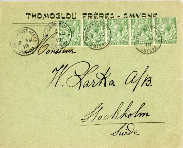 British Levant: 1919 (2 August). Thomoglou Freres – Smyrne imprinted cover to Sweden franked with strip of five 1/2d KGV stamps tied by BPO Smyrna datestamps. Reverse 19 August Stockholm arrival cds’s. Sg. Z282