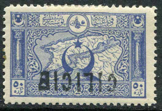 Cilicia: 1919 (4 March). Larger Cilicie handstamped Ottoman stamps 50pa of 1917-18 pictorial issue mint o.g. with inverted handstamp error. signed PAVOILLE PARIS. Mayo 36v