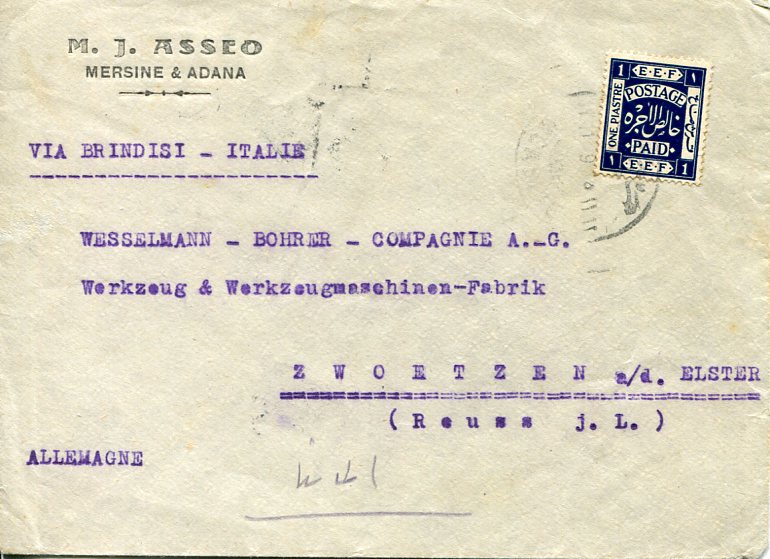 Cilicia: 1919 (11 November). M.J. Assee imprinted cover to Germany franked with 1pi EEF British Military Administration stamp for one piastre foreign letter rate tied by bilingual Mersine 1 datestamp. Reverse next day Adana 1 transit cds. Scarce single franking.