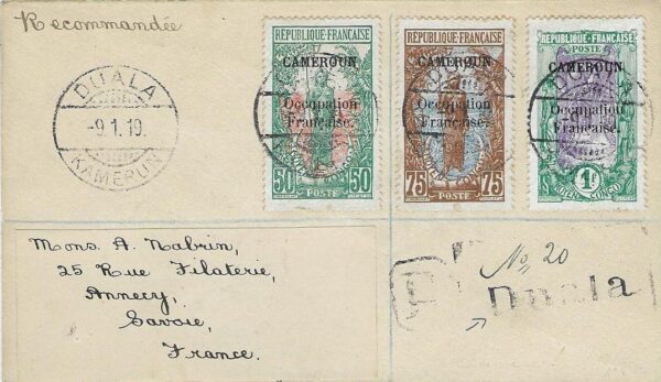 French Cameroun: 1919 (9.1.) registered cover to Annecy, France franked 1916 ‘Occupation Francaise’ 50c., 75c. and 1f. tied German Duala Kamerun cds, registration handstamp at bottom right, arrival backstamp of 14.2.19