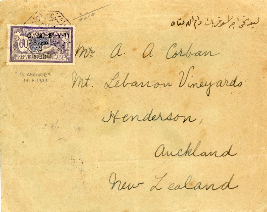 Lebanon: 1921 (11 July). Cover to New Zealand franked with “OMF Syrie” 3pi. surcharged on 60f. French stamps tied by EL-CHEVIR (BEYROUTH) (Longo type 1) datestamp. Reverse next day Beirut dispatch, 14 July Port-Said transit and 26 August Henderson arrival cds’s.