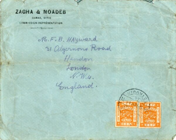 Lebanon: 1919 (24 October). Zagha & Moadeb Damas, Syrie imprinted cover to London franked with two 5m. EEF stamps tied by BEYRUT – BEYROUTH 14 bilingual datestamp. Reverse no postal marking.