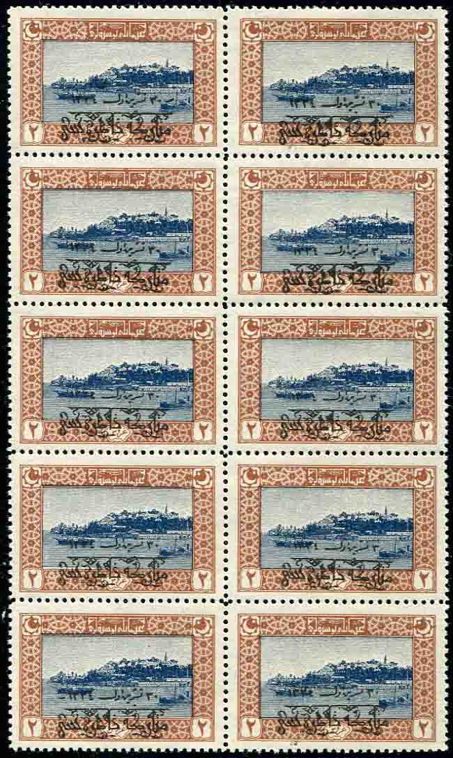 Ottoman: 1919 (21 Jan). Surcharged Armistice commemorative issue 2pi unmounted mint block of 10. Isfila 895