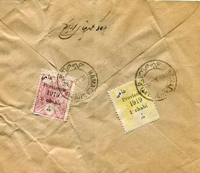 Iran: 1919 (16 November). Cover to Kermanshah franked with 1ch and 5ch ‘Provisoire 1919’ surcharged provisional stamps tied by HAMADAN (DEPART) datestamps and on reverse Kermanchah (Arrivee) arrival cds. Usage of 5ch on cover is scarce. Sg. 527, 529