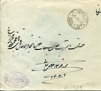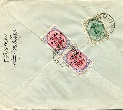 Iran: 1919 (16 March). Commercial cover to Rafsanjan franked with 3ch and a pair of 6ch 1337 surcharged 1kr Ahmed Mirza definitive stamps tied by YEZD (DEPART) datestamps and on reverse 22 March (Bahramabad) Rafsendjan arrival cds. Sg. 363, 519