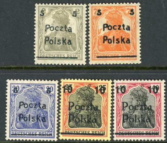 Poland: 1919 (5 August). Poznan Provisional Issue overprinted on German stamps mint o.g. set. Sg. 61/65 *