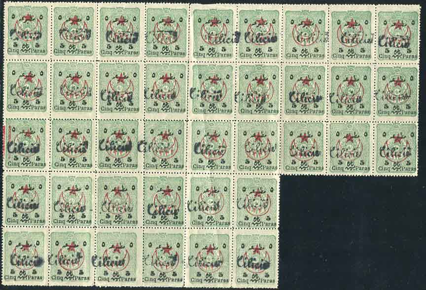 Cilicia: 1919 (1 May). Script Cilicie handstamped on 5pa surcharged on 10pa further overprinted with star & crescent Ottoman issue of 1916, unmounted mint block of 39 with minor varieties. This is probably the largest recorded multipl of this stamp. Mayo 90