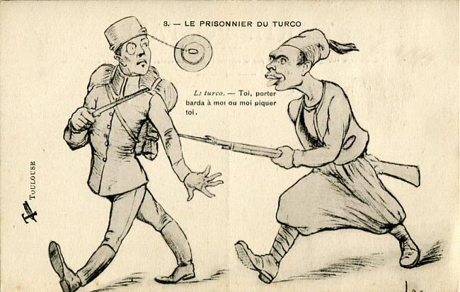 9 July 1919 dated propaganda postcard titled ‘Le Prisonnier du Turco’ with a message ‘Toi, porter barda à moi ou moi piquer toi’. Reverse long message in French