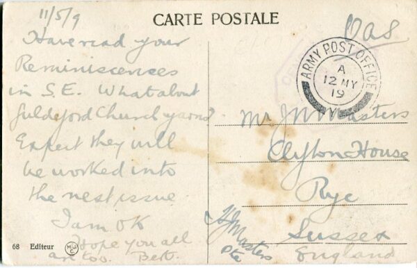 Türkiye – Great Britain: 1919 (12 May). Postcard of Istanbul to Rye, England struck by Army Post Office Y datestamp and Passed Censor #257 hand cachet. Used between 27 March 1919 and 122 February 1920 in Constantinople.