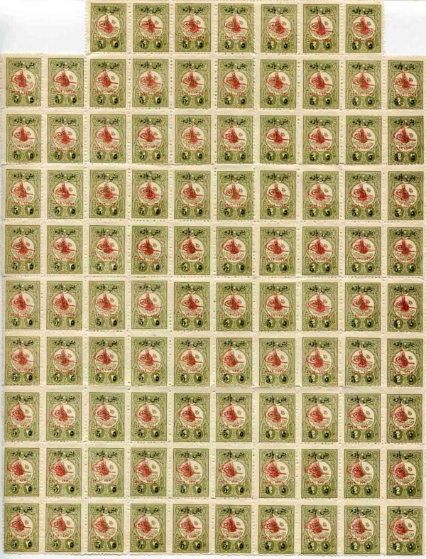 Ottoman Empire: 1919 Printed Matter 5pa surcharged on 2pa unused (no gum) block of 97. Ideal for study. Isfila 903
