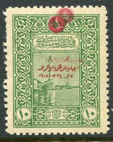 Ottoman: 1919 (3 July). Accession of Sultan Vahideddin overprinted commemorative issue 10pa unmounted mint with overprint double error. A few shortish perfs. signed by Nouri. Isfila 909 SE16