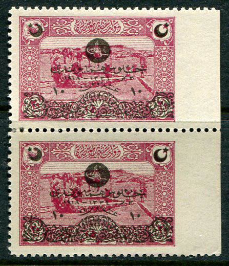 Ottoman: 1919 (3 July). Accession of Sultan Vahideddin overprinted commemorative issue 10pi surcharged on 20pa unmounted mint pair with imperforate margin error. Isfila 921 DE16