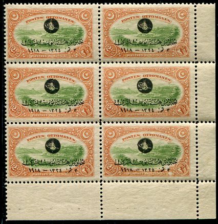 Ottoman Empire: 1919 (3 July). Accession of Sultan Vahideddin overprinted commemorative issue 2 1/2pi unmounted mint corner marginal block of six. Isfila 918. **