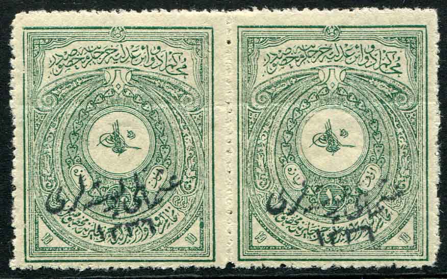 Anatolian Government: 1920 (22 December). OSMANLI POSTALARI 1336 type II handstamped on pair of 10pa grey-green Ottoman Law Courts & Offices Revenue stamp unmounted mint. Total of 745 handstamped in all types. Isfila 973. **