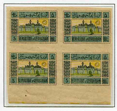 Azerbaijan: 1920 (December). Second printing pictorial imperforate 5r unmounted mint marginal block of 4.