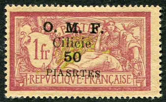 Cilicia: 1920 Thick letters O.M.F. Cilicie 50pi surcharged on 1fr French stamp with PIASRTES instead of PIASTRES error, mint o.g. Yv. 96a