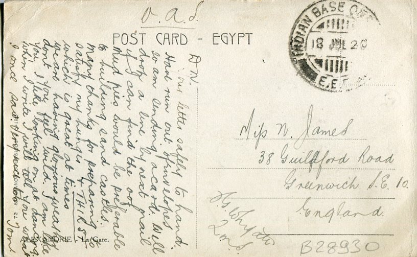 Egypt: 1920 (18 July). Alexandria Railway Station postcard to England struck by INDIAN BASE OFFICE – E.E.F. datestamp.