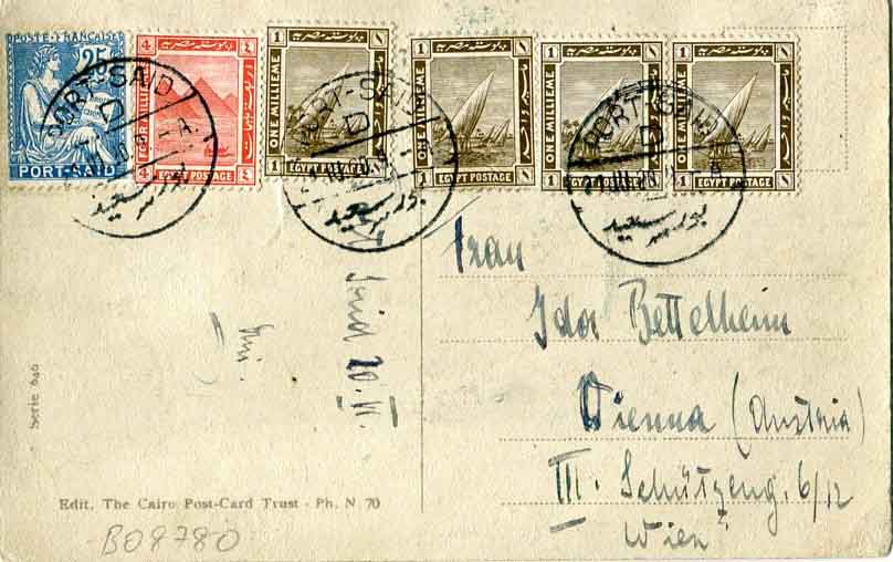 Egypt: 1920 (21 March). Picture postcard to Austria franked with French Post Office in Port Said 25c and four 1m and 4m Egyptian stamps tied by bilingual Port-Said datestamps.