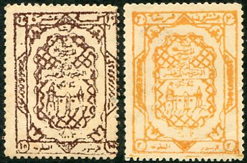 Hejaz: 1920-21. King Hussein flat-rate fiscal documentary issue 15pi deep brown and 20pi orange-yellow mint o.g. Thoden RF10, RF11